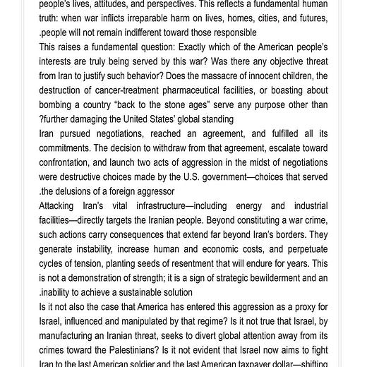 Is it not also the case that America has entered this aggression as a proxy for Israel, influenced and manipulated by that regime? Is it not true that Israel, by manufacturing an Iranian threat, seeks to divert global attention away from its crimes toward the Palestinians? Is it not evident that Israel now aims to fight Iran to the last American soldier and the last American taxpayer dollar—shifting the burden of its delusions onto Iran, the region, and the United States itself in pursuit of illegitimate interests?