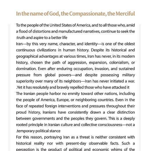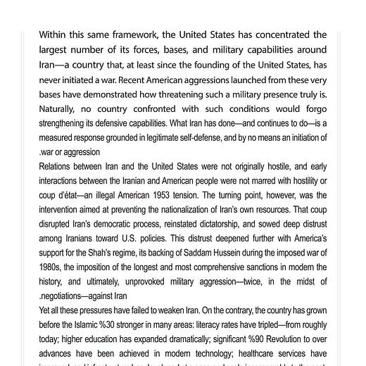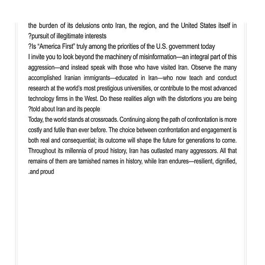 I invite you to look beyond the machinery of misinformation—an integral part of this aggression—and instead speak with those who have visited Iran. Observe the many accomplished Iranian immigrants—educated in Iran—who now teach and conduct research at the world’s most prestigious universities, or contribute to the most advanced technology firms in the West. Do these realities align with the distortions you are being told about Iran and its people?