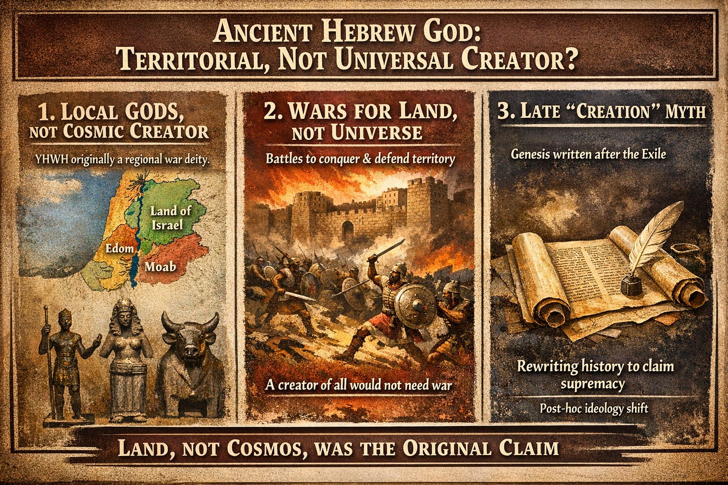 If YHWH were always understood as creator of the universe, the obsession with borders, inheritance, and defeat would be unnecessary. The historical record instead supports a theology that evolved from land-based jurisdiction to cosmic abstraction.